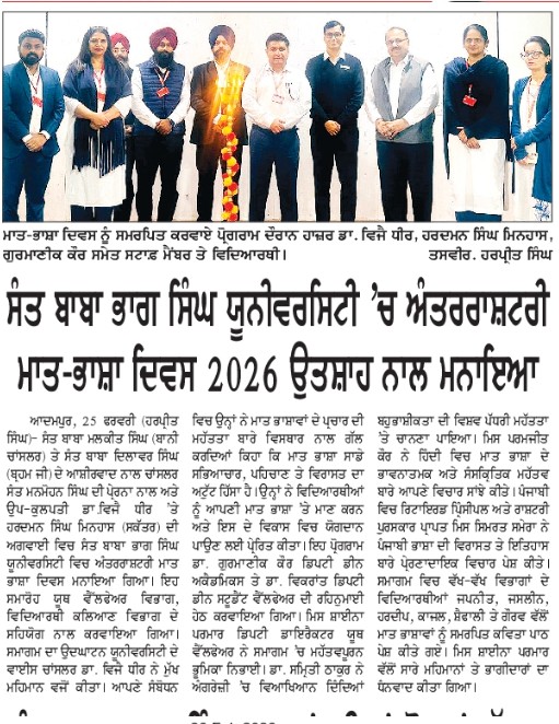 Sant Baba Bhag Singh University celebrated International Mother Language Day 2026 with great enthusiasm and cultural spirit on 23 February 2026 at 11:00 a.m. in the Seminar Hall. The event was organized by the Youth Welfare Department in collaboration with the Department of Student Welfare under the aegis of IQAC, SBBSU. The celebration aimed to highlight the importance of linguistic diversity and promote respect for mother languages among students.
