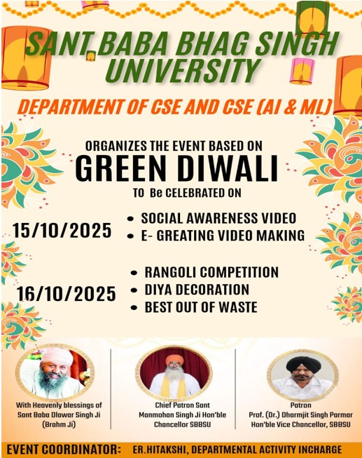 The Department of Computer Science and Engineering and CSE (Artificial Intelligence & Machine Learning) of Sant Baba Bhag Singh University, Jalandhar, successfully organized a vibrant โGreen Diwali Celebrationโ under the UCA Club.