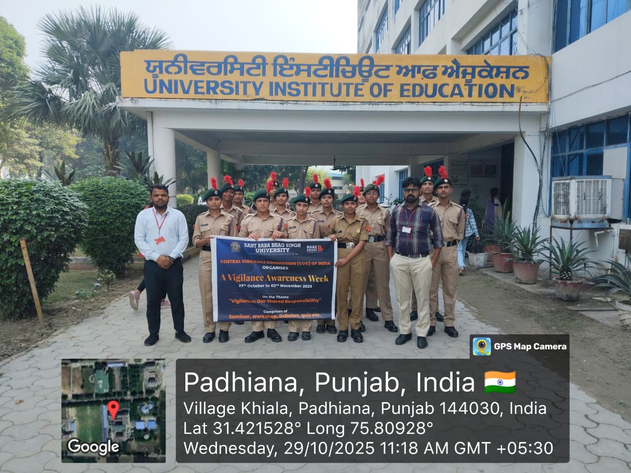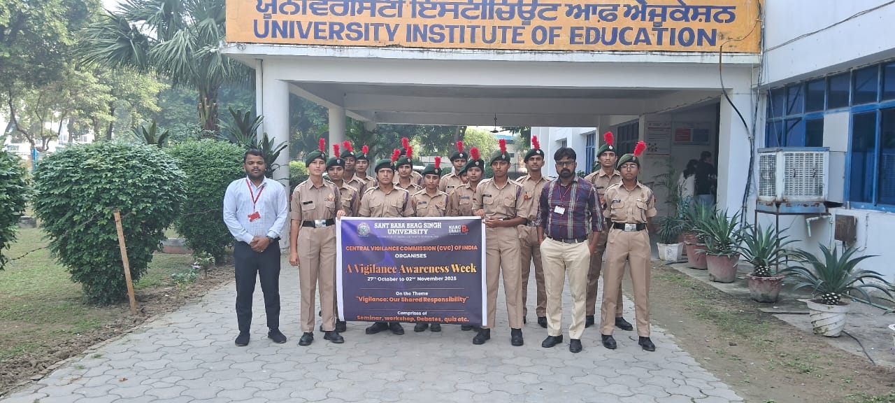 As part of the Vigilance Awareness Week organized by Sant Baba Bhag Singh University under the theme “Vigilance: Our Shared Responsibility”, the NCC Cadets of the university conducted an Awareness Rally on campus. The rally aimed to spread awareness among students and staff about the importance of integrity, transparency, and collective responsibility in combating corruption.