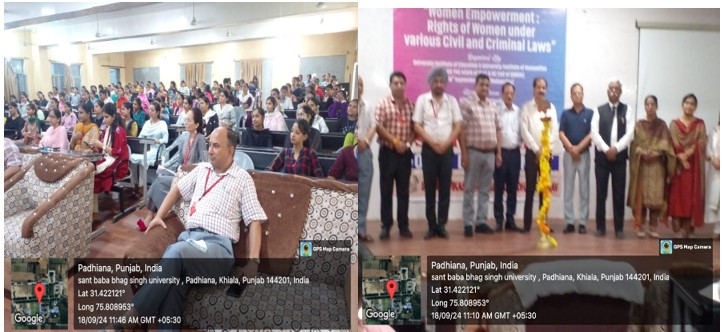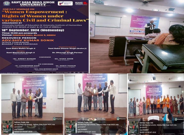 A seminar was conducted on the theme of Women Empowerment: Rights of Women under Various Civil and Criminal Laws on 18 September 2024 in Seminar Hall of Block 5 by Internal Complaints Committee (ICC) of Sant Baba Bhag Singh University, Jalandhar. The session was graced by the presence of Adv. Shiv Kumar Sonik as the Chief Guest for the event. With clarity, conviction and a deep sense of social responsibility, he addressed the girl students, explaining their rights, legal safeguards and the power they hold as women in society. The seminar witnessed the dignified presence of the Dr. Dharmjit Singh Parmar, Hon’ble Vice Chancellor, SBBSU, Dr. Aneet Kumar, Registrar and Dean UIE, Dr. Vijay Dhir, Dean Academics and Deans of various institutes. The collective engagement of faculty, students and leadership elevated the seminar into a moment of learning, empowerment and institutional pride. Few glimpses of the event have been shared below.