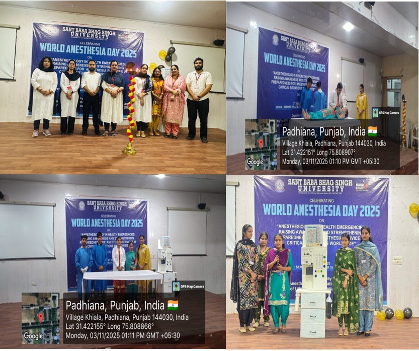 Under the aegis of IQAC, the discipline of Anesthesia and Operation Theatre Technology, Department of Life Science and Allied Health Sciences (UIS), Sant Baba Bhag Singh University, celebrated World Anesthesia Day 2025 on 3rd November 2025 at the University Seminar Hall. The event commenced with a warm welcome, followed by a traditional lamp-lighting ceremony that symbolized knowledge, healing, and service to humanity. Dignitaries, faculty members, and students graced the inauguration, marking the beginning of a meaningful and inspiring celebration. The event was inaugurated by Honourable Dr. Aksh Sharma (Coordinator), department of Life Science and Allied Health Sciences. The current year's theme of the event was “Anesthesiology in Health Emergencies: Raising Awareness and Strengthening Preparedness for Anesthesia Services in Critical Situations Worldwide” and aimed to highlight the crucial role of anesthesiologists and OT technologists in emergency and critical care settings, especially during global health crises. The event was focused on enhancing awareness, preparedness, and education in safe anesthesia practices, emergency response, and patient care. The program featured various activities conducted during the celebration, including; • Speech competition • Quiz competition • Skit/Drama presentation • Model Presentation Around 30 students participated in these activities. In a successfully organized event, participants showcased remarkable talent and enthusiasm. After a competitive performance, the winners were declared and awarded with certificates. Overall, the event was a tribute to all healthcare heroes who work behind the scenes in operation theatres, ensuring patient safety with knowledge, skill, and dedication. Overall, the event was a tribute to all healthcare heroes who work behind the scenes in operation theatres, ensuring patient safety with knowledge, skill, and dedication.