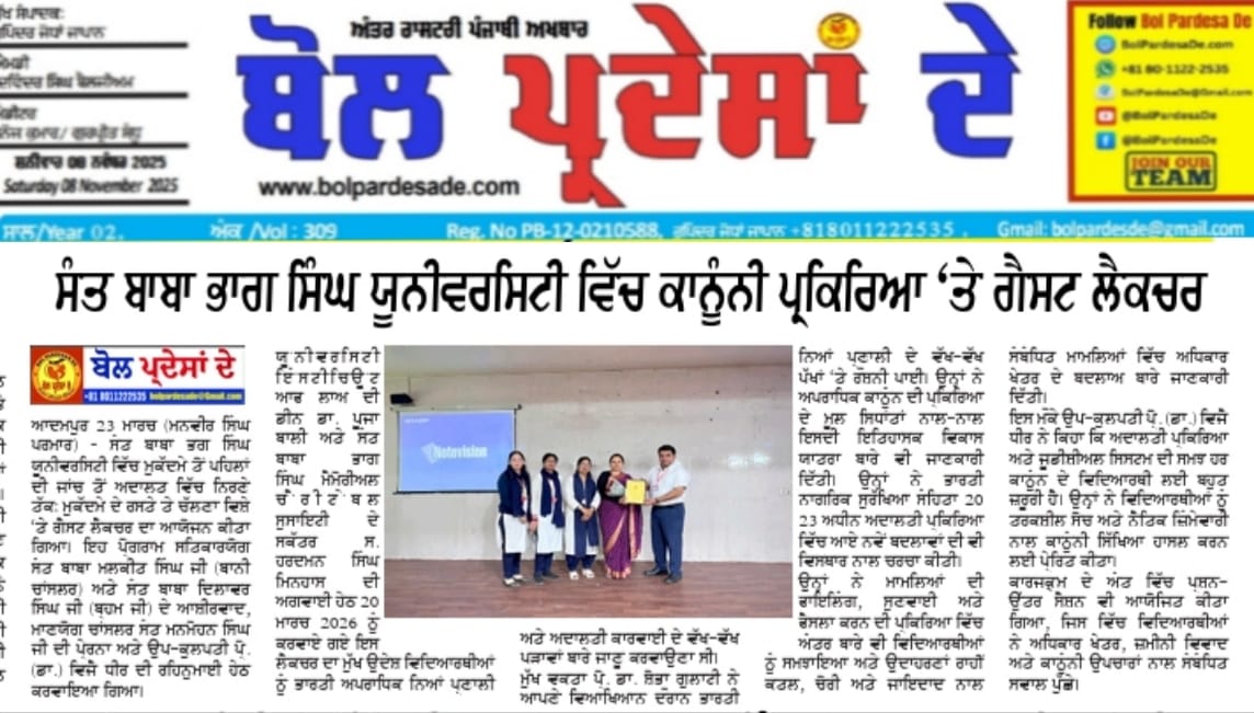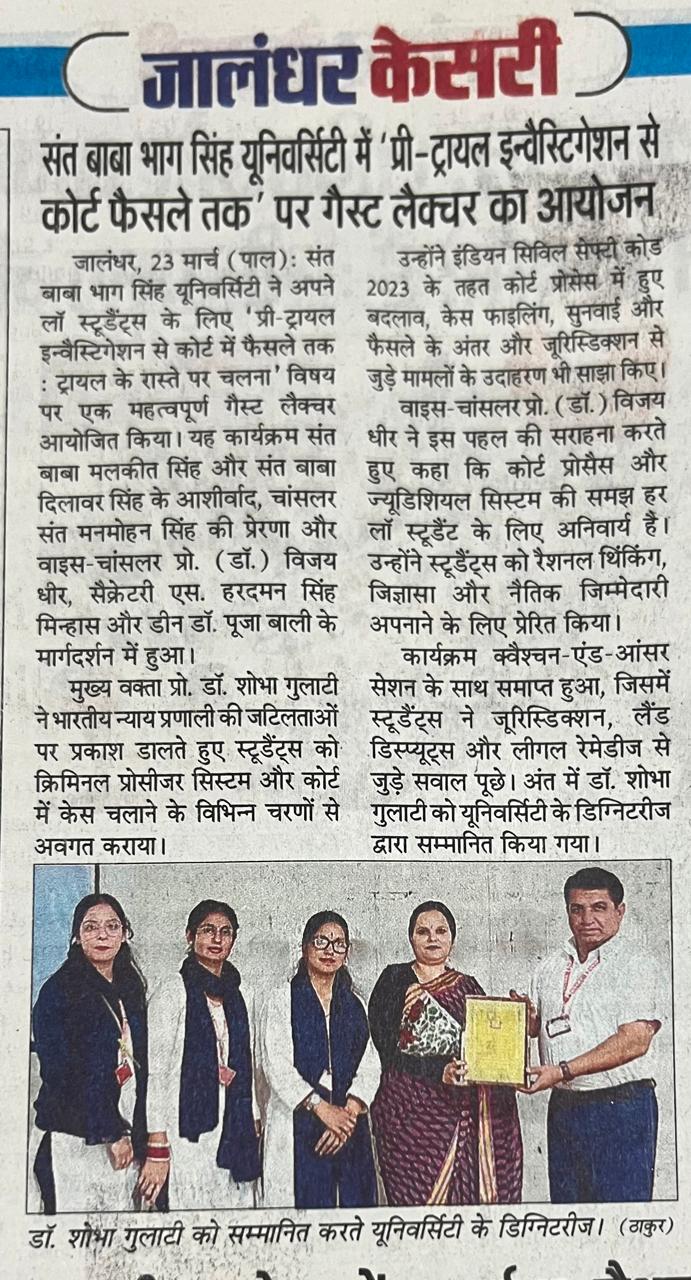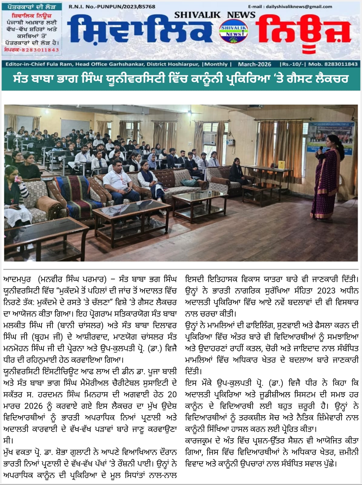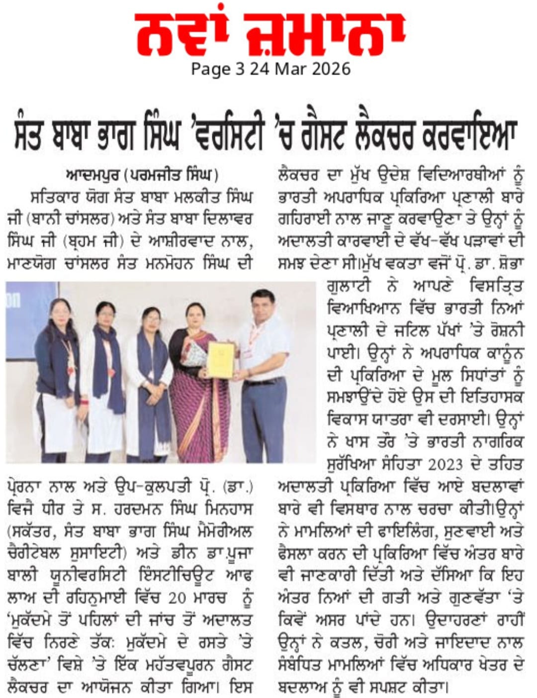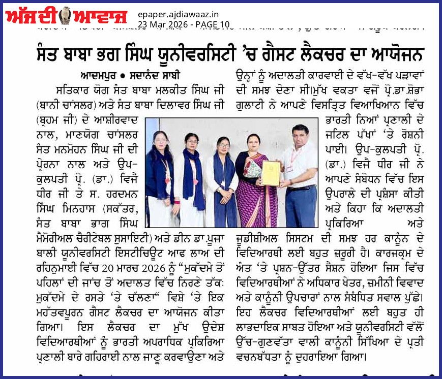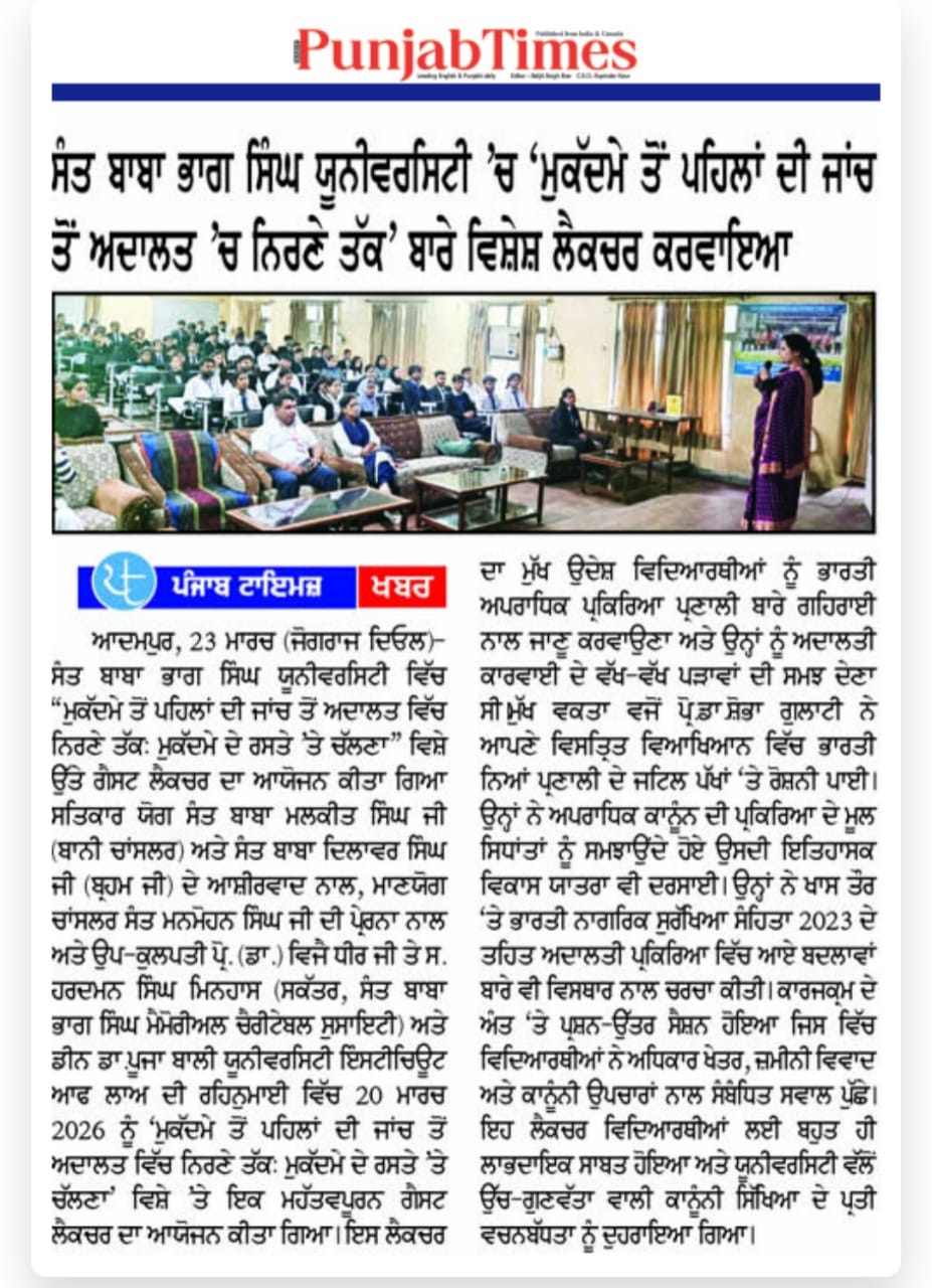ਸੰਤ ਬਾਬਾ ਭਗ ਸਿੰਘ ਯੂਨੀਵਰਸਿਟੀ ਵਿੱਚ “ਮੁਕੱਦਮੇ ਤੋਂ ਪਹਿਲਾਂ ਦੀ ਜਾਂਚ ਤੋਂ ਅਦਾਲਤ ਵਿੱਚ ਨਿਰਣੇ ਤੱਕ: ਮੁਕੱਦਮੇ ਦੇ ਰਸਤੇ 'ਤੇ ਚੱਲਣਾ” ਵਿਸ਼ੇ ਉੱਤੇ ਗੈਸਟ ਲੈਕਚਰ ਦਾ ਆਯੋਜਨ ਕੀਤਾ ਗਿਆ ਸਤਿਕਾਰ ਯੋਗ ਸੰਤ ਬਾਬਾ ਮਲਕੀਤ ਸਿੰਘ ਜੀ (ਬਾਨੀ ਚਾਂਸਲਰ) ਅਤੇ ਸੰਤ ਬਾਬਾ ਦਿਲਾਵਰ ਸਿੰਘ ਜੀ (ਬ੍ਰਹਮ ਜੀ) ਦੇ ਆਸ਼ੀਰਵਾਦ ਨਾਲ, ਮਾਣਯੋਗ ਚਾਂਸਲਰ ਸੰਤ ਮਨਮੋਹਨ ਸਿੰਘ ਜੀ ਦੀ ਪ੍ਰੇਰਨਾ ਨਾਲ ਅਤੇ ਉਪ-ਕੁਲਪਤੀ ਪ੍ਰੋ. (ਡਾ.) ਵਿਜੈ ਧੀਰ ਜੀ ਤੇ ਸ. ਹਰਦਮਨ ਸਿੰਘ ਮਿਨਹਾਸ (ਸਕੱਤਰ, ਸੰਤ ਬਾਬਾ ਭਾਗ ਸਿੰਘ ਮੈਮੋਰੀਅਲ ਚੈਰੀਟੇਬਲ ਸੁਸਾਇਟੀ) ਅਤੇ ਡੀਨ ਡਾ.ਪੂਜਾ ਬਾਲੀ ਯੂਨੀਵਰਸਿਟੀ ਇੰਸਟੀਚਿਊਟ ਆਫ ਲਾਅ ਦੀ ਰਹਿਨੁਮਾਈ ਵਿੱਚ 20 ਮਾਰਚ 2026 ਨੂੰ "ਮੁਕੱਦਮੇ ਤੋਂ ਪਹਿਲਾਂ ਦੀ ਜਾਂਚ ਤੋਂ ਅਦਾਲਤ ਵਿੱਚ ਨਿਰਣੇ ਤੱਕ: ਮੁਕੱਦਮੇ ਦੇ ਰਸਤੇ 'ਤੇ ਚੱਲਣਾ" ਵਿਸ਼ੇ ‘ਤੇ ਇਕ ਮਹੱਤਵਪੂਰਨ ਗੈਸਟ ਲੈਕਚਰ ਦਾ ਆਯੋਜਨ ਕੀਤਾ ਗਿਆ। ਇਸ ਲੈਕਚਰ ਦਾ ਮੁੱਖ ਉਦੇਸ਼ ਵਿਦਿਆਰਥੀਆਂ ਨੂੰ ਭਾਰਤੀ ਅਪਰਾਧਿਕ ਪ੍ਰਕਿਰਿਆ ਪ੍ਰਣਾਲੀ ਬਾਰੇ ਗਹਿਰਾਈ ਨਾਲ ਜਾਣੂ ਕਰਵਾਉਣਾ ਅਤੇ ਉਨ੍ਹਾਂ ਨੂੰ ਅਦਾਲਤੀ ਕਾਰਵਾਈ ਦੇ ਵੱਖ-ਵੱਖ ਪੜਾਵਾਂ ਦੀ ਸਮਝ ਦੇਣਾ ਸੀ।ਮੁੱਖ ਵਕਤਾ ਵਜੋਂ ਪ੍ਰੋ.ਡਾ.ਸ਼ੋਭਾ ਗੁਲਾਟੀ ਨੇ ਆਪਣੇ ਵਿਸਤ੍ਰਿਤ ਵਿਆਖਿਆਨ ਵਿੱਚ ਭਾਰਤੀ ਨਿਆਂ ਪ੍ਰਣਾਲੀ ਦੇ ਜਟਿਲ ਪੱਖਾਂ ‘ਤੇ ਰੋਸ਼ਨੀ ਪਾਈ। ਉਨ੍ਹਾਂ ਨੇ ਅਪਰਾਧਿਕ ਕਾਨੂੰਨ ਦੀ ਪ੍ਰਕਿਰਿਆ ਦੇ ਮੂਲ ਸਿਧਾਂਤਾਂ ਨੂੰ ਸਮਝਾਉਂਦੇ ਹੋਏ ਉਸਦੀ ਇਤਿਹਾਸਕ ਵਿਕਾਸ ਯਾਤਰਾ ਵੀ ਦਰਸਾਈ। ਉਨ੍ਹਾਂ ਨੇ ਖਾਸ ਤੌਰ ‘ਤੇ ਭਾਰਤੀ ਨਾਗਰਿਕ ਸੁਰੱਖਿਆ ਸੰਹਿਤਾ 2023 ਦੇ ਤਹਿਤ ਅਦਾਲਤੀ ਪ੍ਰਕਿਰਿਆ ਵਿੱਚ ਆਏ ਬਦਲਾਵਾਂ ਬਾਰੇ ਵੀ ਵਿਸਥਾਰ ਨਾਲ ਚਰਚਾ ਕੀਤੀ।ਉਨ੍ਹਾਂ ਨੇ ਮਾਮਲਿਆਂ ਦੀ ਫਾਇਲਿੰਗ, ਸੁਣਵਾਈ ਅਤੇ ਫੈਸਲਾ ਕਰਨ ਦੀ ਪ੍ਰਕਿਰਿਆ ਵਿੱਚ ਅੰਤਰ ਬਾਰੇ ਵੀ ਜਾਣਕਾਰੀ ਦਿੱਤੀ ਅਤੇ ਦੱਸਿਆ ਕਿ ਇਹ ਅੰਤਰ ਨਿਆਂ ਦੀ ਗਤੀ ਅਤੇ ਗੁਣਵੱਤਾ ‘ਤੇ ਕਿਵੇਂ ਅਸਰ ਪਾਂਦੇ ਹਨ। ਉਦਾਹਰਣਾਂ ਰਾਹੀਂ ਉਨ੍ਹਾਂ ਨੇ ਕਤਲ, ਚੋਰੀ ਅਤੇ ਜਾਇਦਾਦ ਨਾਲ ਸੰਬੰਧਿਤ ਮਾਮਲਿਆਂ ਵਿੱਚ ਅਧਿਕਾਰ ਖੇਤਰ ਦੇ ਬਦਲਾਅ ਨੂੰ ਵੀ ਸਪਸ਼ਟ ਕੀਤਾ।ਉਪ-ਕੁਲਪਤੀ ਪ੍ਰੋ. (ਡਾ.) ਵਿਜੈ ਧੀਰ ਜੀ ਨੇ ਆਪਣੇ ਸੰਬੋਧਨ ਵਿੱਚ ਇਸ ਉਪਰਾਲੇ ਦੀ ਪ੍ਰਸ਼ੰਸਾ ਕੀਤੀ ਅਤੇ ਕਿਹਾ ਕਿ ਅਦਾਲਤੀ ਪ੍ਰਕਿਰਿਆ ਅਤੇ ਜੂਡੀਸ਼ੀਅਲ ਸਿਸਟਮ ਦੀ ਸਮਝ ਹਰ ਕਾਨੂੰਨ ਦੇ ਵਿਦਿਆਰਥੀ ਲਈ ਬਹੁਤ ਜ਼ਰੂਰੀ ਹੈ। ਉਨ੍ਹਾਂ ਨੇ ਵਿਦਿਆਰਥੀਆਂ ਨੂੰ ਤਰਕਸ਼ੀਲ ਸੋਚ, ਜਿਗਿਆਸਾ ਅਤੇ ਨੈਤਿਕ ਜ਼ਿੰਮੇਵਾਰੀ ਨੂੰ ਅਪਣਾਉਣ ਲਈ ਪ੍ਰੇਰਿਤ ਕੀਤਾ।ਕਾਰਜਕ੍ਰਮ ਦੇ ਅੰਤ ‘ਤੇ ਪ੍ਰਸ਼ਨ-ਉੱਤਰ ਸੈਸ਼ਨ ਹੋਇਆ ਜਿਸ ਵਿੱਚ ਵਿਦਿਆਰਥੀਆਂ ਨੇ ਅਧਿਕਾਰ ਖੇਤਰ, ਜ਼ਮੀਨੀ ਵਿਵਾਦ ਅਤੇ ਕਾਨੂੰਨੀ ਉਪਚਾਰਾਂ ਨਾਲ ਸੰਬੰਧਿਤ ਸਵਾਲ ਪੁੱਛੇ। ਇਹ ਲੈਕਚਰ ਵਿਦਿਆਰਥੀਆਂ ਲਈ ਬਹੁਤ ਹੀ ਲਾਭਦਾਇਕ ਸਾਬਤ ਹੋਇਆ ਅਤੇ ਯੂਨੀਵਰਸਿਟੀ ਵੱਲੋਂ ਉੱਚ-ਗੁਣਵੱਤਾ ਵਾਲੀ ਕਾਨੂੰਨੀ ਸਿੱਖਿਆ ਦੇ ਪ੍ਰਤੀ ਵਚਨਬੱਧਤਾ ਨੂੰ ਦੁਹਰਾਇਆ ਗਿਆ।