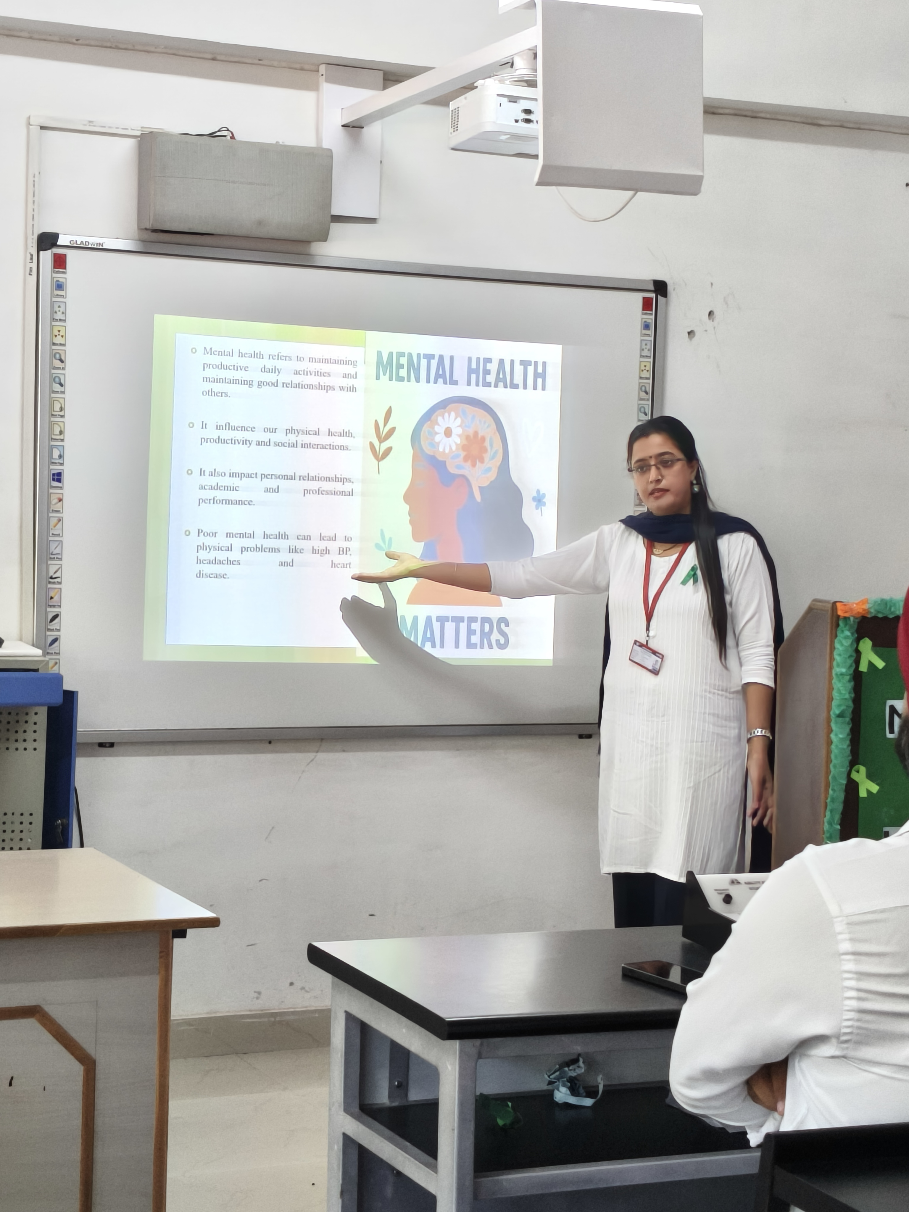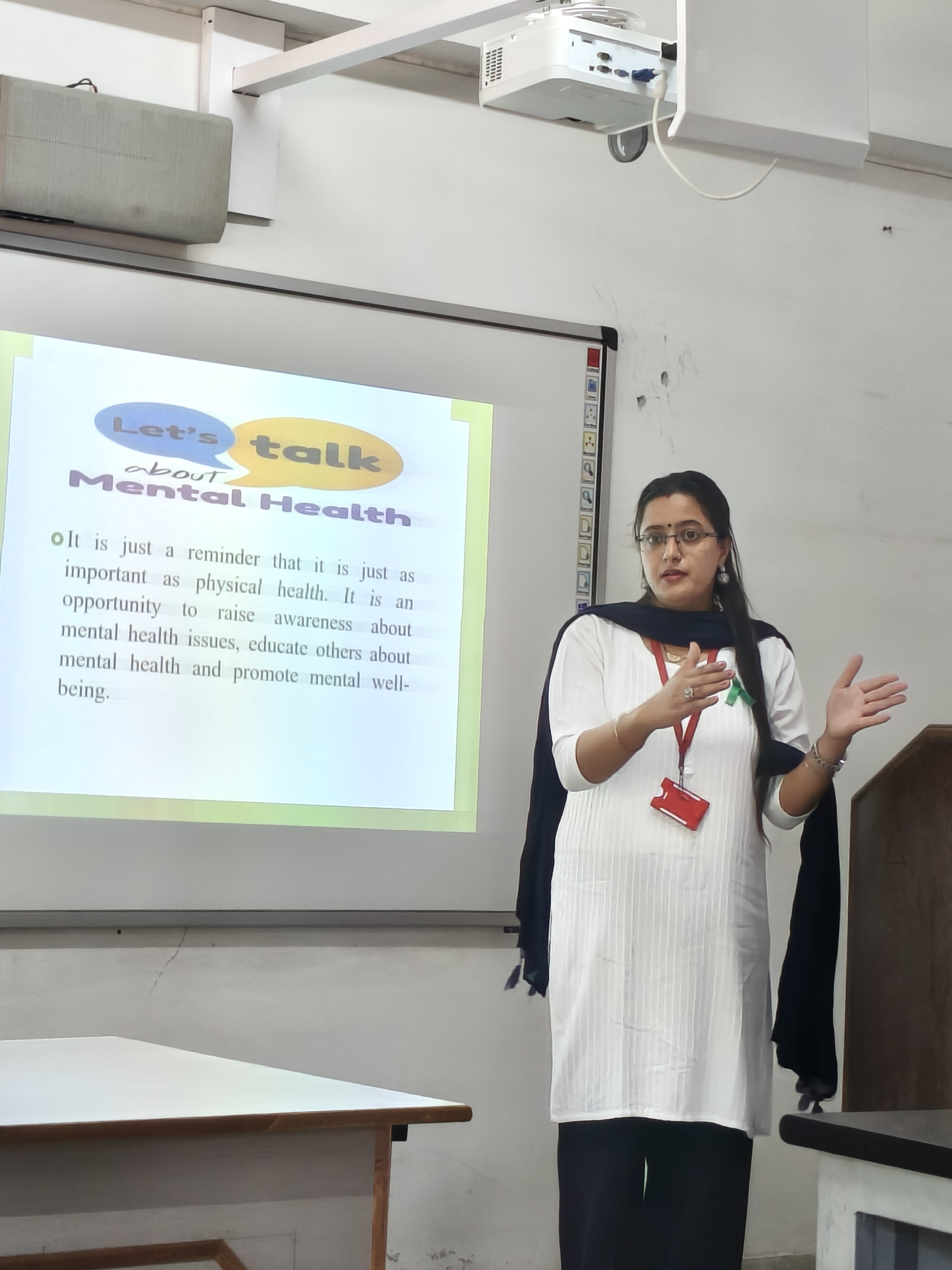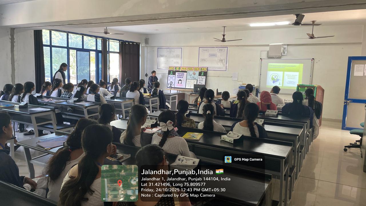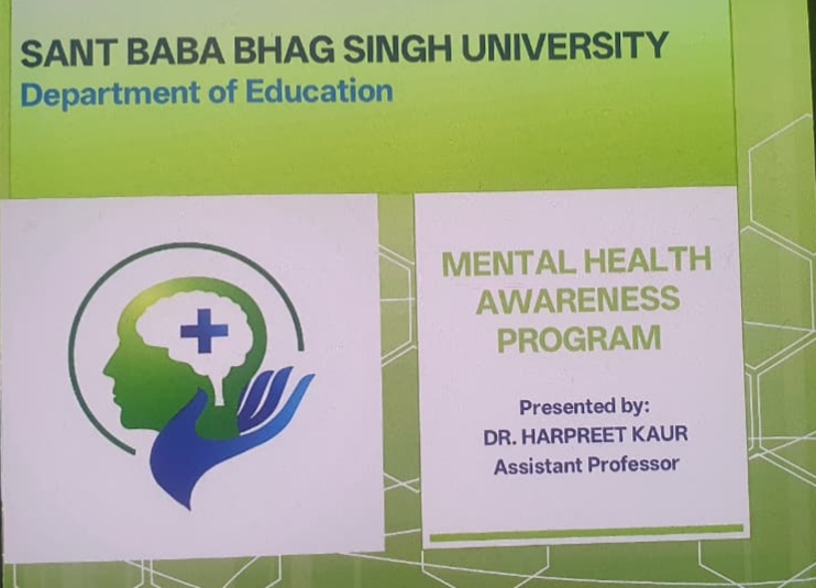 As the guidelines and directions received from the honorable supreme court regarding the Mental Health programs. Organized a Seminar on "MENTAL HEALTH AWARENESS PROGRAMME " by Dr. Harpreet Kaur Assistant Professor from the Department of Education on 24 October 2025 at Sant Baba Bhag University. Under the Guidance of Worthy Vice Chancellor Prof. Dr. Dharmjit Singh Parmar, Respected Dean Dr. Aneet Kumar and Respected Dean Academics Dr. Vijay Dhir. This seminar aimed to aware the students about mental health and how to deal with mental health issues. In this seminar, total 17 Students from B.Ed. stream and 16 Students from Fashion Designing department and 20 Faculty members participated in this activity. It aimed to aware the students about mental health and how to deal with mental health issues and detailed information was provided by Dr. Harpreet kaur on various aspects of mental health. In this seminar, students were also participated with poster making and speech on mental health. Overall, the Session emphasized on how to educate others about mental health and promote mental well-being also emphasized on Why Mental Health matters? How to be mentally healthy and tips to improve mental health? How mental health is related to make decisions and build positive relations in society? Students participated enthusiastically in this seminar.