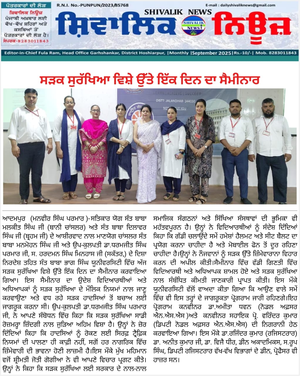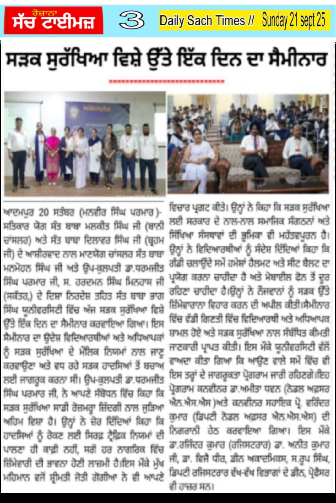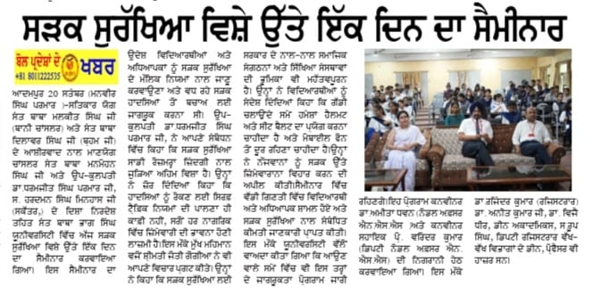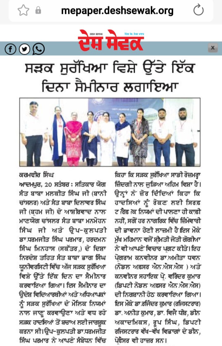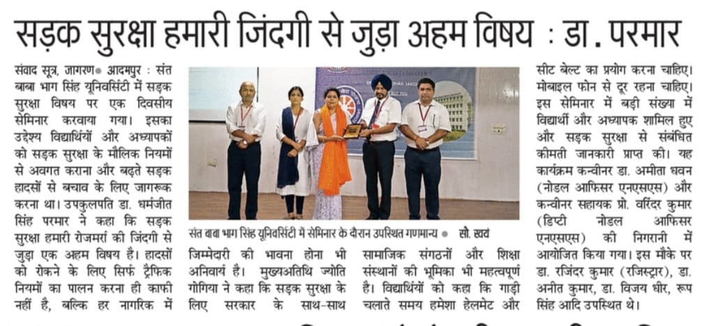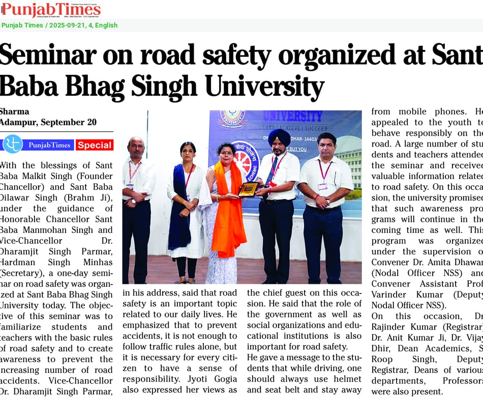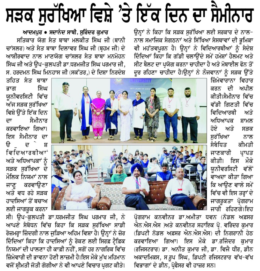 ਸਤਿਕਾਰ ਯੋਗ ਸੰਤ ਬਾਬਾ ਮਲਕੀਤ ਸਿੰਘ ਜੀ (ਬਾਨੀ ਚਾਂਸਲਰ) ਅਤੇ ਸੰਤ ਬਾਬਾ ਦਿਲਾਵਰ ਸਿੰਘ ਜੀ (ਬ੍ਰਹਮ ਜੀ) ਦੇ ਆਸ਼ੀਰਵਾਦ ਨਾਲ ਮਾਣਯੋਗ ਚਾਂਸਲਰ ਸੰਤ ਬਾਬਾ ਮਨਮੋਹਨ ਸਿੰਘ ਜੀ ਅਤੇ ਉਪ-ਕੁਲਪਤੀ ਡਾ.ਧਰਮਜੀਤ ਸਿੰਘ ਪਰਮਾਰ ਜੀ, ਸ. ਹਰਦਮਨ ਸਿੰਘ ਮਿਨਹਾਸ ਜੀ (ਸਕੱਤਰ,) ਦੇ ਦਿਸ਼ਾ ਨਿਰਦੇਸ਼ ਤਹਿਤ ਸੰਤ ਬਾਬਾ ਭਾਗ ਸਿੰਘ ਯੂਨੀਵਰਸਿਟੀ ਵਿੱਚ ਅੱਜ ਸੜਕ ਸੁਰੱਖਿਆ ਵਿਸ਼ੇ ਉੱਤੇ ਇੱਕ ਦਿਨ ਦਾ ਸੈਮੀਨਾਰ ਕਰਵਾਇਆ ਗਿਆ। ਇਸ ਸੈਮੀਨਾਰ ਦਾ ਉਦੇਸ਼ ਵਿਦਿਆਰਥੀਆਂ ਅਤੇ ਅਧਿਆਪਕਾਂ ਨੂੰ ਸੜਕ ਸੁਰੱਖਿਆ ਦੇ ਮੌਲਿਕ ਨਿਯਮਾਂ ਨਾਲ ਜਾਣੂ ਕਰਵਾਉਣਾ ਅਤੇ ਵਧ ਰਹੇ ਸੜਕ ਹਾਦਸਿਆਂ ਤੋਂ ਬਚਾਅ ਲਈ ਜਾਗਰੂਕ ਕਰਨਾ ਸੀ। ਉਪ-ਕੁਲਪਤੀ ਡਾ.ਧਰਮਜੀਤ ਸਿੰਘ ਪਰਮਾਰ ਜੀ, ਨੇ ਆਪਣੇ ਸੰਬੋਧਨ ਵਿੱਚ ਕਿਹਾ ਕਿ ਸੜਕ ਸੁਰੱਖਿਆ ਸਾਡੀ ਰੋਜ਼ਮਰ੍ਹਾ ਜ਼ਿੰਦਗੀ ਨਾਲ ਜੁੜਿਆ ਅਹਿਮ ਵਿਸ਼ਾ ਹੈ। ਉਨ੍ਹਾਂ ਨੇ ਜ਼ੋਰ ਦਿੰਦਿਆਂ ਕਿਹਾ ਕਿ ਹਾਦਸਿਆਂ ਨੂੰ ਰੋਕਣ ਲਈ ਸਿਰਫ਼ ਟ੍ਰੈਫ਼ਿਕ ਨਿਯਮਾਂ ਦੀ ਪਾਲਣਾ ਹੀ ਕਾਫ਼ੀ ਨਹੀਂ, ਸਗੋਂ ਹਰ ਨਾਗਰਿਕ ਵਿੱਚ ਜ਼ਿੰਮੇਵਾਰੀ ਦੀ ਭਾਵਨਾ ਹੋਣੀ ਲਾਜ਼ਮੀ ਹੈ।ਇਸ ਮੌਕੇ ਮੁੱਖ ਮਹਿਮਾਨ ਵਜੋਂ ਸ਼੍ਰੀਮਤੀ ਜੋਤੀ ਗੋਗੀਆ ਨੇ ਵੀ ਆਪਣੇ ਵਿਚਾਰ ਪ੍ਰਗਟ ਕੀਤੇ। ਉਨ੍ਹਾਂ ਨੇ ਕਿਹਾ ਕਿ ਸੜਕ ਸੁਰੱਖਿਆ ਲਈ ਸਰਕਾਰ ਦੇ ਨਾਲ-ਨਾਲ ਸਮਾਜਿਕ ਸੰਗਠਨਾਂ ਅਤੇ ਸਿੱਖਿਆ ਸੰਸਥਾਵਾਂ ਦੀ ਭੂਮਿਕਾ ਵੀ ਮਹੱਤਵਪੂਰਨ ਹੈ। ਉਨ੍ਹਾਂ ਨੇ ਵਿਦਿਆਰਥੀਆਂ ਨੂੰ ਸੰਦੇਸ਼ ਦਿੰਦਿਆਂ ਕਿਹਾ ਕਿ ਗੱਡੀ ਚਲਾਉਂਦੇ ਸਮੇਂ ਹਮੇਸ਼ਾਂ ਹੈਲਮਟ ਅਤੇ ਸੀਟ ਬੈਲਟ ਦਾ ਪ੍ਰਯੋਗ ਕਰਨਾ ਚਾਹੀਦਾ ਹੈ ਅਤੇ ਮੋਬਾਈਲ ਫੋਨ ਤੋਂ ਦੂਰ ਰਹਿਣਾ ਚਾਹੀਦਾ ਹੈ।ਉਨ੍ਹਾਂ ਨੇ ਨੌਜਵਾਨਾਂ ਨੂੰ ਸੜਕ ਉੱਤੇ ਜ਼ਿੰਮੇਵਾਰਾਨਾ ਵਿਹਾਰ ਕਰਨ ਦੀ ਅਪੀਲ ਕੀਤੀ।ਸੈਮੀਨਾਰ ਵਿੱਚ ਵੱਡੀ ਗਿਣਤੀ ਵਿੱਚ ਵਿਦਿਆਰਥੀ ਅਤੇ ਅਧਿਆਪਕ ਸ਼ਾਮਲ ਹੋਏ ਅਤੇ ਸੜਕ ਸੁਰੱਖਿਆ ਨਾਲ ਸੰਬੰਧਿਤ ਕੀਮਤੀ ਜਾਣਕਾਰੀ ਪ੍ਰਾਪਤ ਕੀਤੀ। ਇਸ ਮੌਕੇ ਯੂਨੀਵਰਸਿਟੀ ਵੱਲੋਂ ਵਾਅਦਾ ਕੀਤਾ ਗਿਆ ਕਿ ਆਉਣ ਵਾਲੇ ਸਮੇਂ ਵਿੱਚ ਵੀ ਇਸ ਤਰ੍ਹਾਂ ਦੇ ਜਾਗਰੂਕਤਾ ਪ੍ਰੋਗਰਾਮ ਜਾਰੀ ਰਹਿਣਗੇ।ਇਹ ਪ੍ਰੋਗਰਾਮ ਕਨਵੀਨਰ ਡਾ.ਅਮੀਤਾ ਧਵਨ (ਨੋਡਲ ਅਫ਼ਸਰ ਐਨ.ਐਸ.ਐਸ )ਅਤੇ ਕਨਵੀਨਰ ਸਹਾਇਕ ਪ੍ਰੋ. ਵਰਿੰਦਰ ਕੁਮਾਰ (ਡਿਪਟੀ ਨੋਡਲ ਅਫ਼ਸਰ ਐਨ.ਐਸ.ਐਸ) ਦੀ ਨਿਗਰਾਨੀ ਹੇਠ ਕਰਵਾਇਆ ਗਿਆ। ਇਸ ਮੌਕੇ ਡਾ.ਰਜਿੰਦਰ ਕੁਮਾਰ (ਰਜਿਸਟਰਾਰ) ਡਾ. ਅਨੀਤ ਕੁਮਾਰ ਜੀ, ਡਾ. ਵਿਜੈ ਧੀਰ, ਡੀਨ ਅਕਾਦਮਿਕਸ, ਸ.ਰੂਪ ਸਿੰਘ, ਡਿਪਟੀ ਰਜਿਸਟਰਾਰ ਵੱਖ-ਵੱਖ ਵਿਭਾਗਾਂ ਦੇ ਡੀਨ, ਪ੍ਰੋਫੈਸਰ ਵੀ ਹਾਜ਼ਰ ਸਨ।